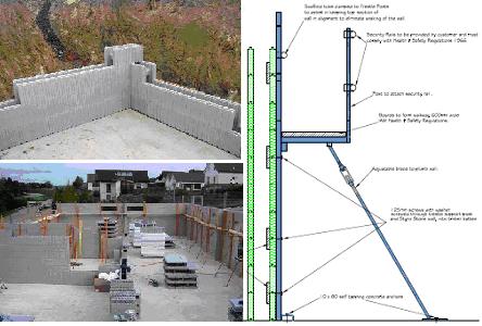 The concrete should be a ready mixed, uniform pump grade C20-25 for the walls and C28-35 for the foundation. 10 mm should be the maximum aggregate size with a minimum 350-375 (kg/m3) cement content and a slump factor of 75-120mm.
